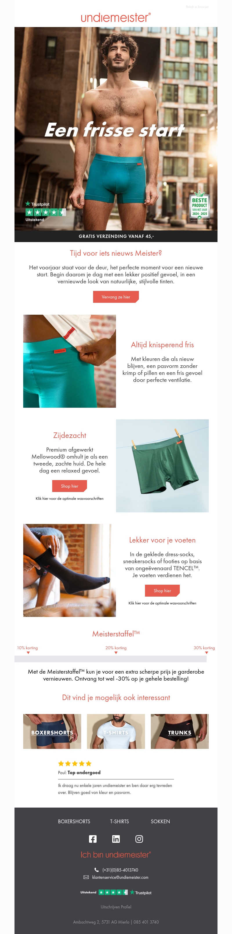 Het voorjaar is het perfecte moment voor een nieuwe start. Undiemeister biedt je een vernieuwde look met natuurlijke tinten en ultiem comfort. Ontdek de zachtheid van Mellowood® en de perfect ventilerende pasvorm voor frisse dagen.