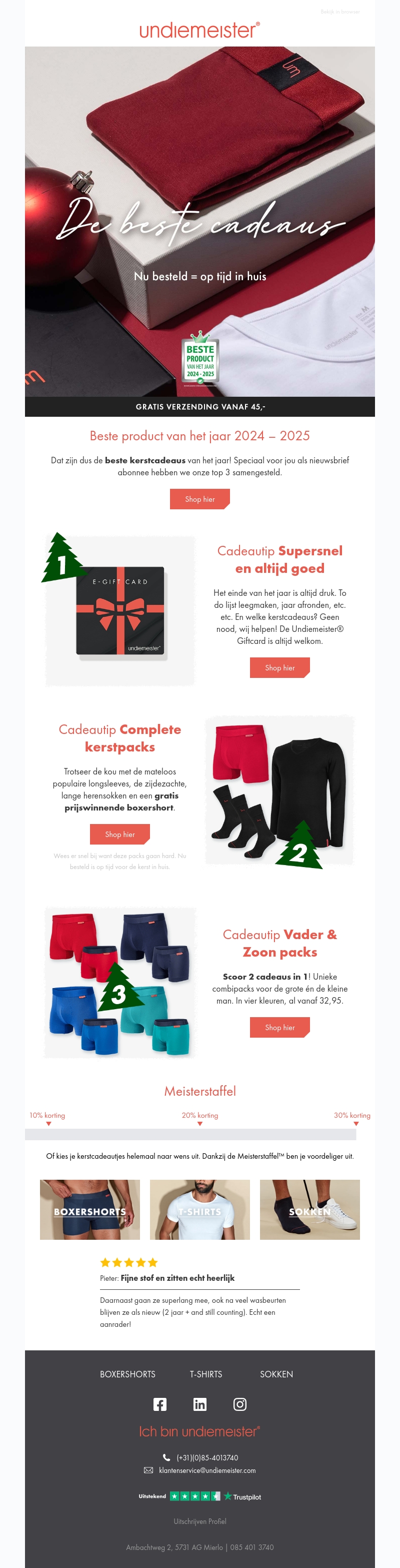 Ontdek de top 3 kerstcadeaus van Undiemeister® voor 2024-2025. Onze selectie bevat de exclusieve E-Giftcard, complete kerstpacks en unieke vader & zoon packs. Bestel nu en geniet van gratis verzending vanaf €45. Maak je feestdagen compleet met deze must-have cadeaus!