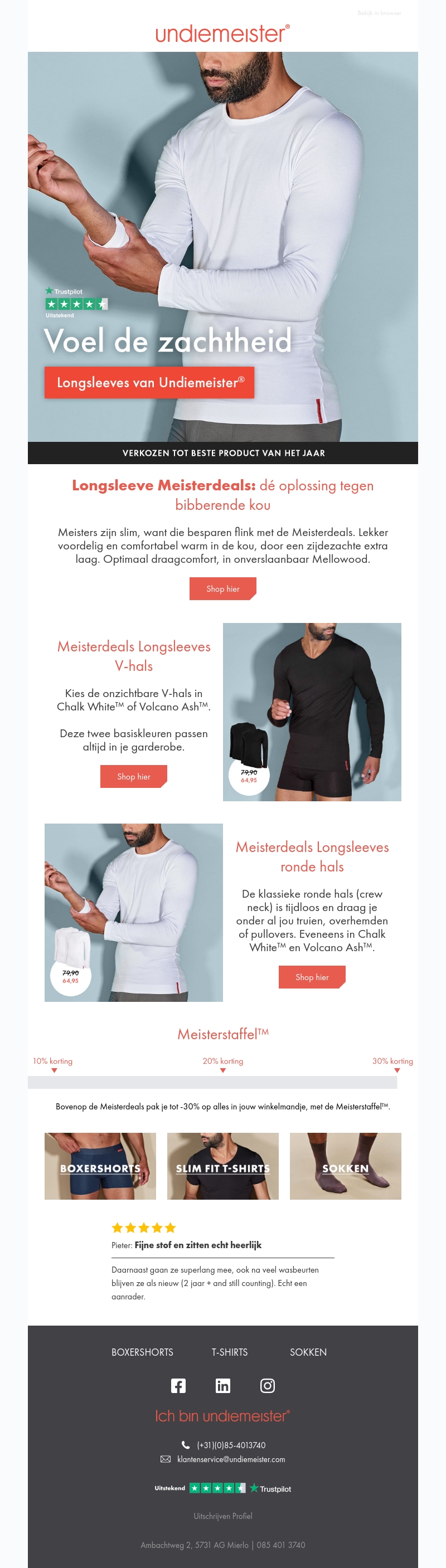 Bespaar aanzienlijk met de Meisterdeals op longsleeves van Undiemeister. Ontworpen voor optimaal draagcomfort in iedere kou, dankzij het zijdezachte Mellowood. Kies uit V-hals of ronde hals designs in stijlvolle kleuren. Profiteer bovendien van de Meisterstaffel voor extra korting.
