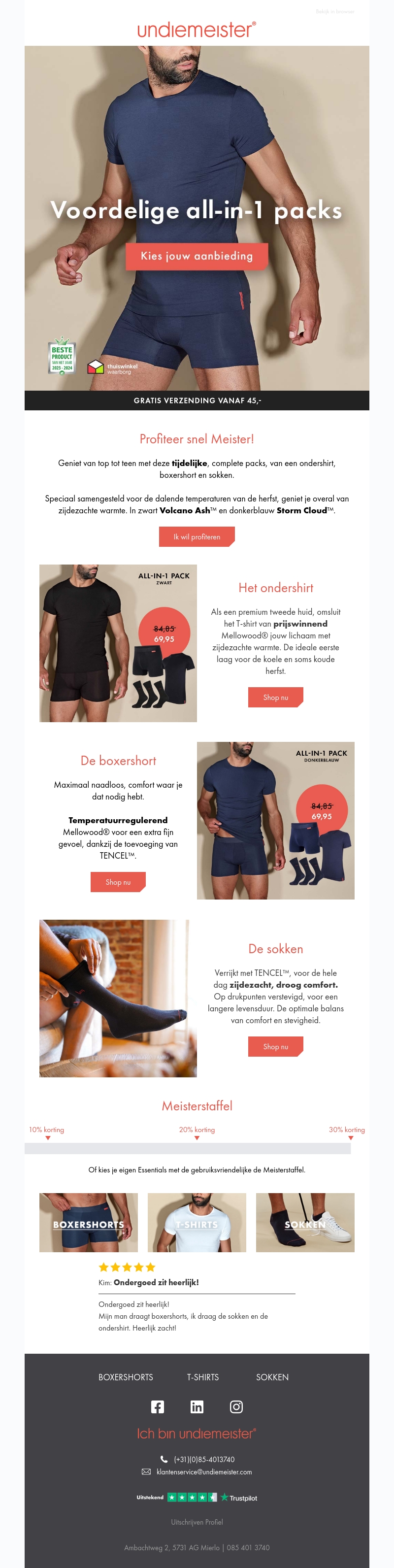 Maak gebruik van de speciale All-in-1 packs van Undiemeister. Deze tijdelijke aanbiedingen bevatten een ondershirt, boxershort en sokken. Perfect voor het koelere herfstweer. Verkrijgbaar in kleuren als zwart en donkerblauw, bieden deze sets de ultieme combinatie van comfort en stijl.
