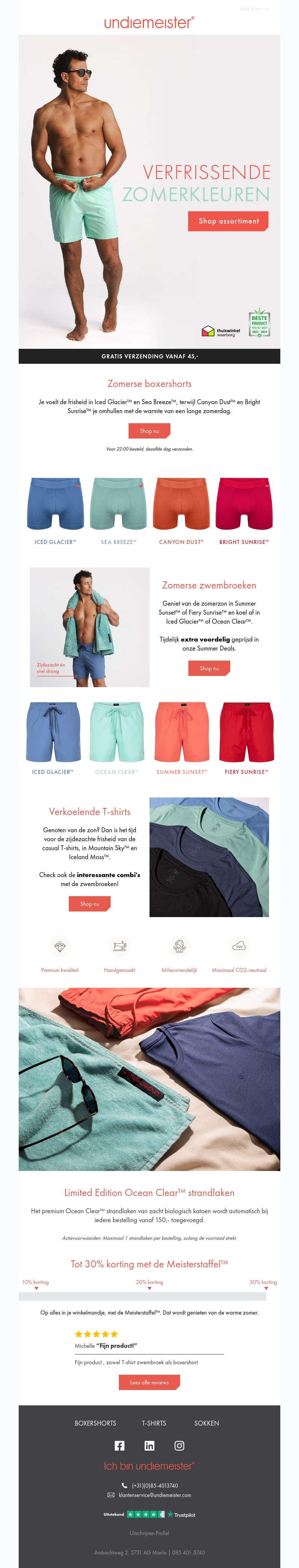 Undiemeister presenteert de verfrissende zomerkleuren collectie van boxer shorts, zwemshorts en T-shirts. Geniet van luxe, handgemaakte producten met premium kwaliteit, milieuvriendelijk en maximaal CO2-neutraal. Shop nu en ontvang gratis een Limited Edition strandlaken bij elke bestelling vanaf €150.
