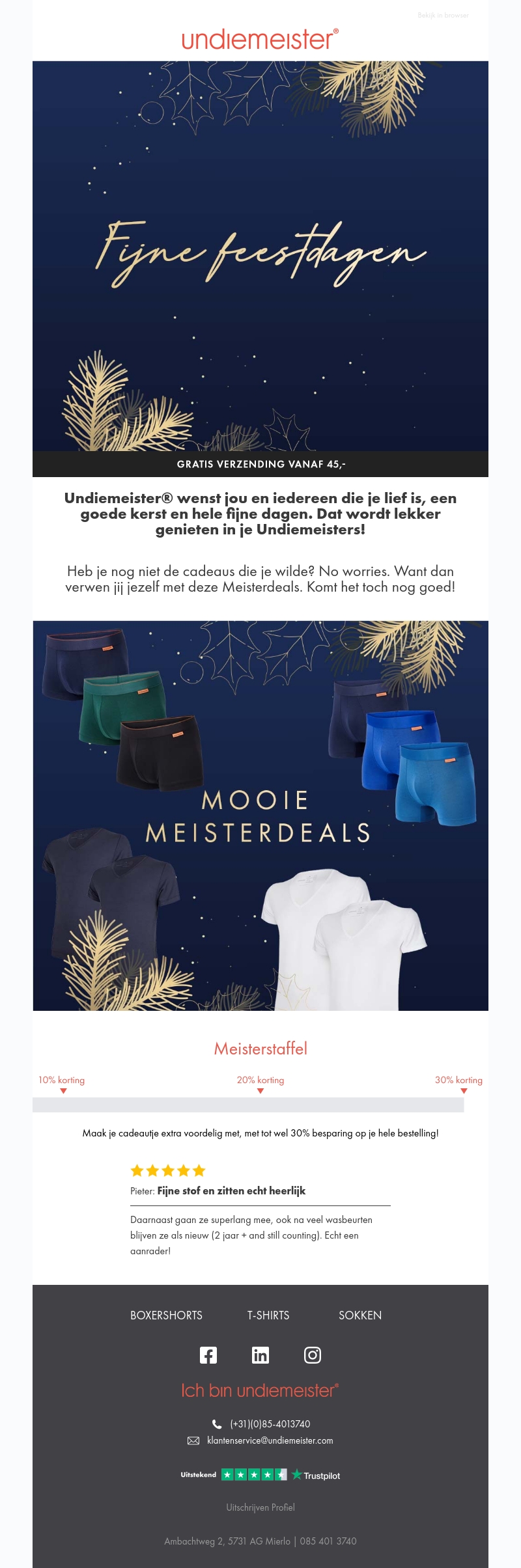 Undiemeister® wenst iedereen een fijne kerst met speciale Meisterdeals. Geniet van comfortabele boxershorts, T-shirts en sokken. Bespaar tot wel 30% op je bestelling dankzij de Meisterstaffel kortingen. Ontvang gratis verzending bij bestellingen vanaf €45. Geef jezelf of een geliefde het cadeau van ultiem comfort en stijl.
