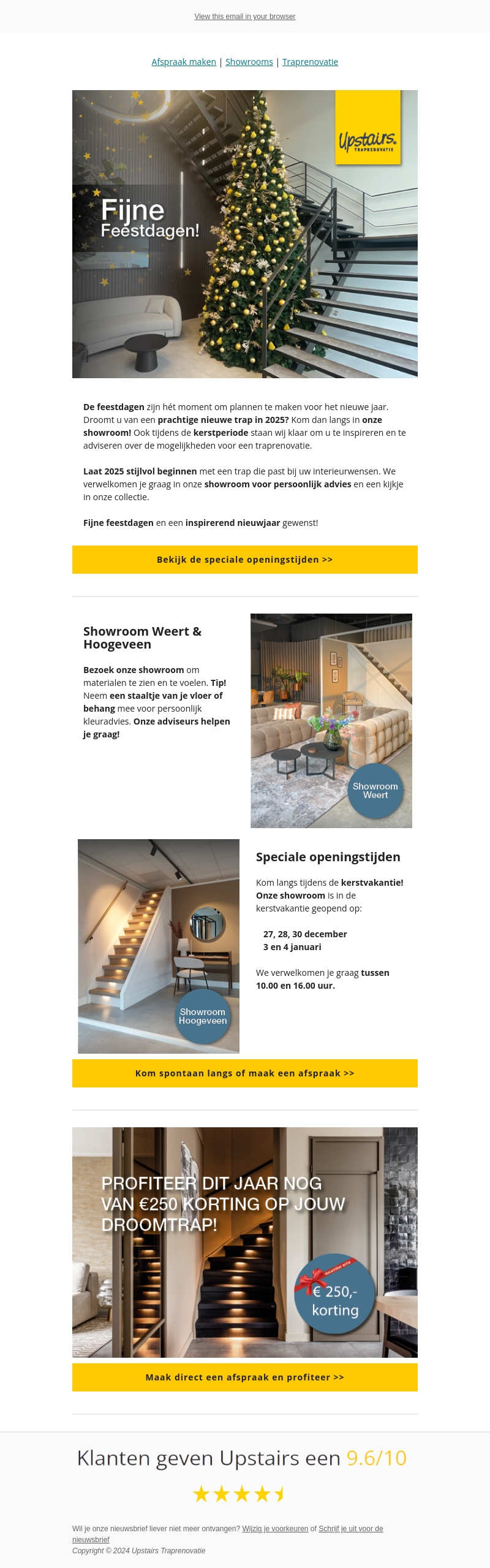 Vier de feestdagen met Upstairs in Weert en Hoogeveen. Geniet van unieke traprenovatie advies tijdens onze speciale kerstopeningsuren. Laat 2025 stijlvol beginnen met een prachtige nieuwe trap. Bezoek onze showrooms en profiteer van een exclusieve €250 korting. Onze experts helpen u graag bij het kiezen van de juiste stijl.