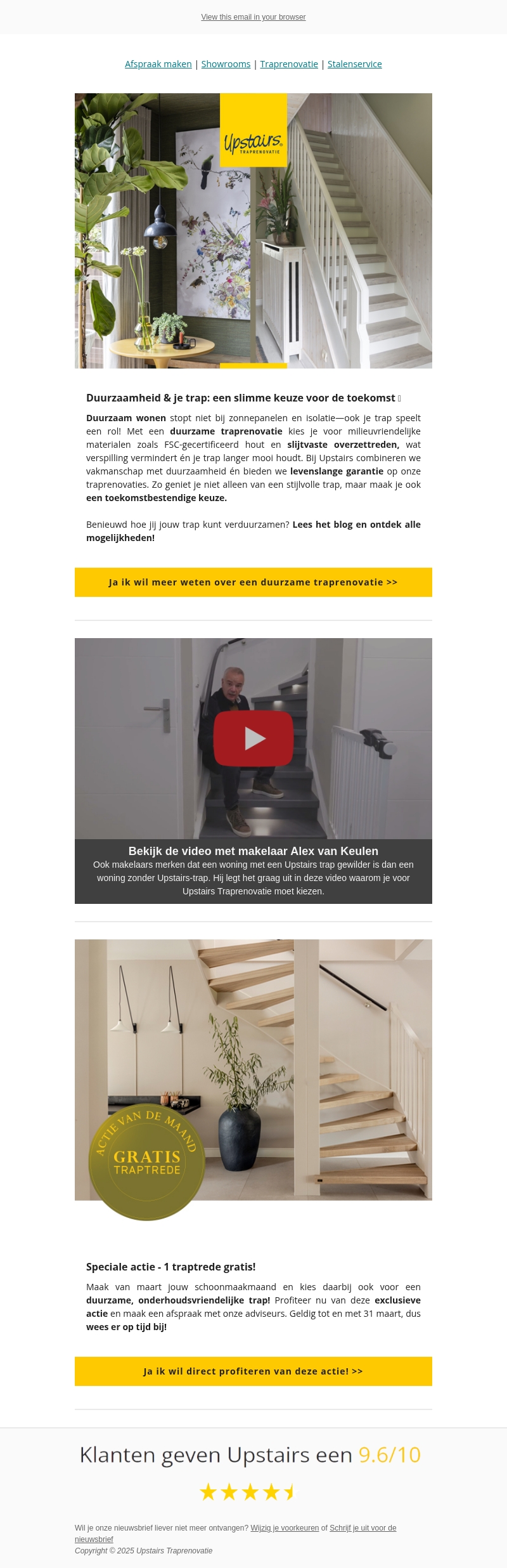Duurzaam wonen houdt niet op bij zonnepanelen: ook je trap kan een rol spelen. Kies voor een duurzame traprenovatie met milieuvriendelijke materialen. Bekijk de video met makelaar Alex van Keulen en profiteer van onze speciale actie: 1 gratis traptrede in maart. Ontdek hoe je trap bijdraagt aan een stijlvolle en toekomstbestendige woning.