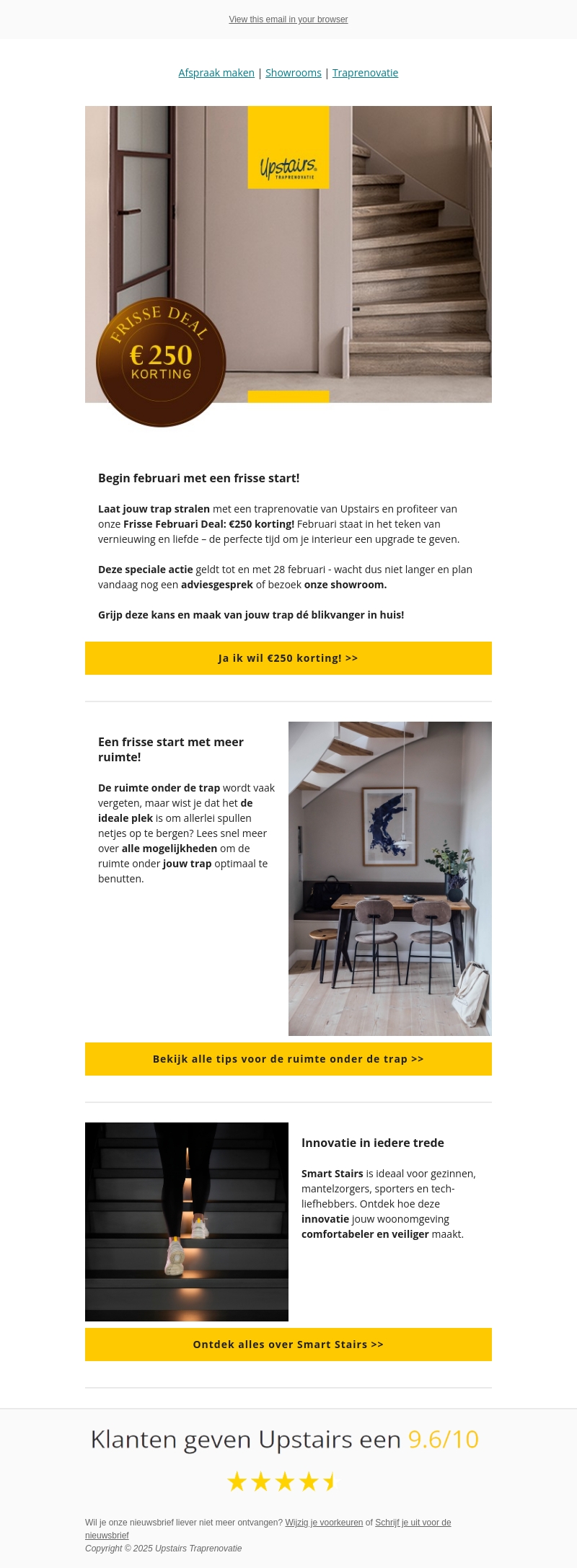 Laat jouw trap stralen met een traprenovatie bij Upstairs. Profiteer nu van onze Frisse Februari Deal van €250 korting. Transformeer je interieur en maak van je trap dé blikvanger in huis. Plan vandaag nog een adviesgesprek of bezoek onze showroom.
