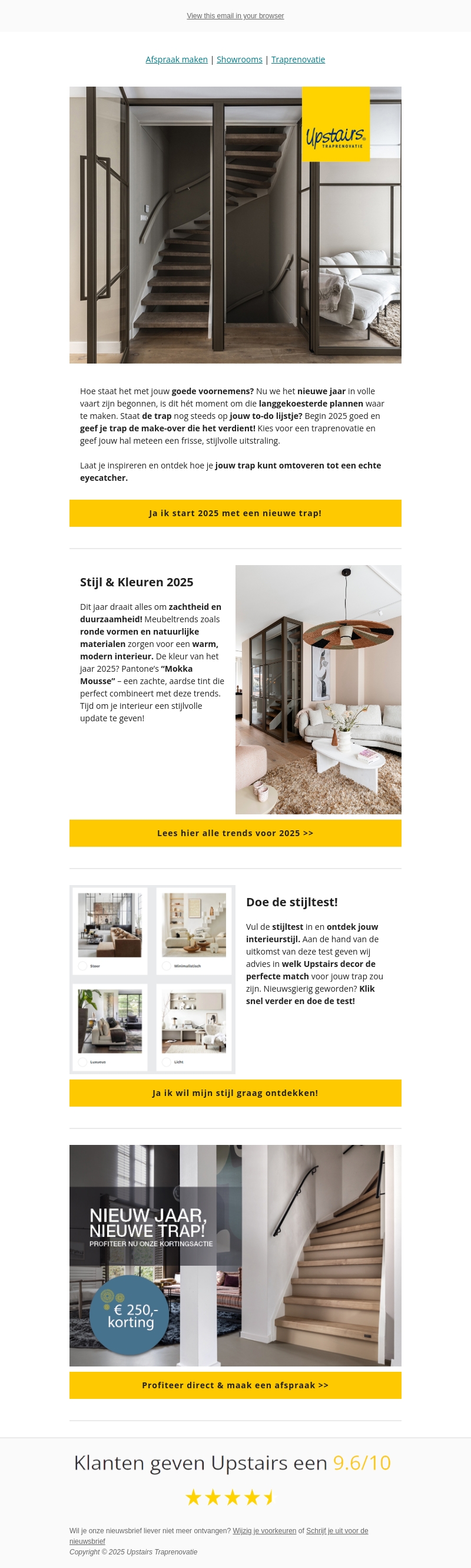 Begin 2025 goed met een traprenovatie en ontdek de nieuwste trends voor je interieur. Laat je inspireren door zachte en duurzame designs, en vind de perfecte stijl met onze stijlenquΓͺte. Profiteer van een speciale korting en geef je trap de make-over die hij verdient.