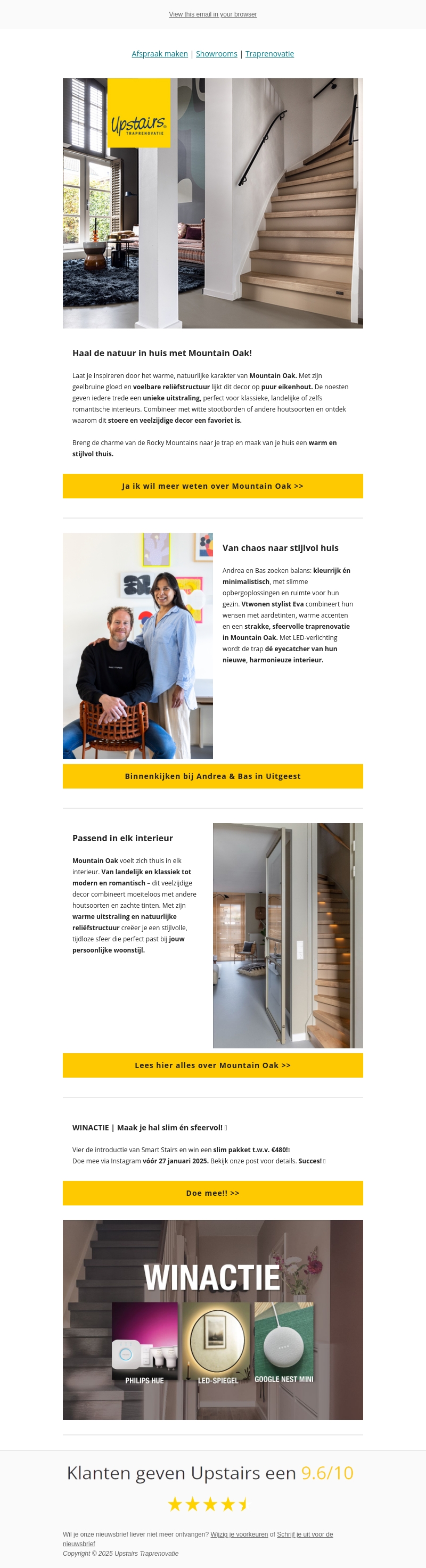 Laat je inspireren door het warme, natuurlijke karakter van Mountain Oak. Deze veelzijdige trapbekleding biedt een unieke uitstraling voor zowel moderne als klassieke interieurs. Ontdek slimme opbergoplossingen en creëer een harmonieuze sfeer in huis. Geschikt voor elke stijl, van romantisch tot minimalistisch. Doe mee met onze winactie voor een stijlvolle upgrade!