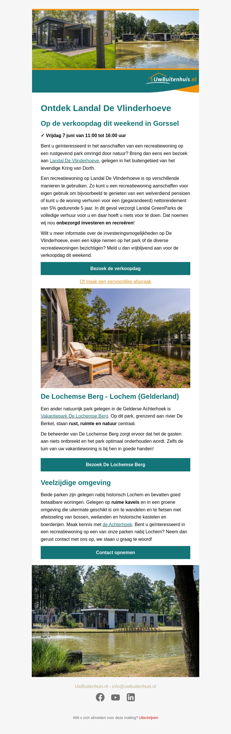 Bezoek dit weekend de verkoopdag bij Landal De Vlinderhoeve en ontdek recreatiewoningen in een natuurrijke omgeving in Gorssel. Ontdek ook Vakantiepark De Lochemse Berg, gelegen in de Gelderse Achterhoek. Beide parken bieden ruime kavels en een rustige, groene omgeving. Meld u vrijblijvend aan voor de verkoopdag of maak een persoonlijke afspraak.