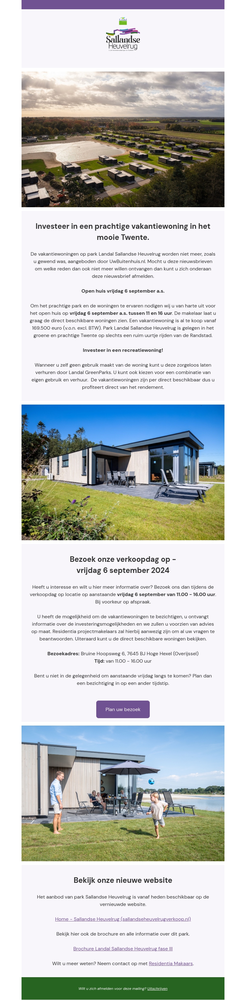 Ontdek de kans om te investeren in een vakantiewoning op het mooie park Landal Sallandse Heuvelrug. Bezoek onze speciale verkoopdag op vrijdag 6 september en krijg uitgebreide informatie. Profiteer direct van het rendement door zelf gebruik te maken of een ander ermee te verblijden. Mis deze kans niet!