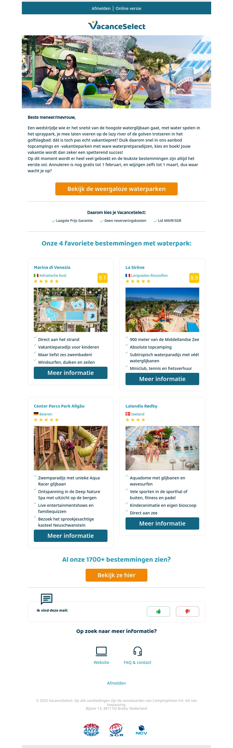 Beleef deze zomer ultiem plezier in een van de geweldige waterparken van VacanceSelect. Van spannende glijbanen tot lazy rivers en golfslagbaden, er is voor ieder wat wils. Boek nu zonder zorgen dankzij flexibele annulerings- en wijzigingsmogelijkheden. Ontdek onze topbestemmingen zoals Marina di Venezia en Center Parcs Park Allgäu!