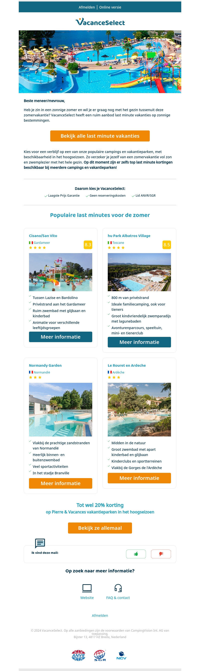 Heb je zin in een zonnige zomer? VacanceSelect biedt een breed scala aan last minute vakanties naar populaire bestemmingen. Profiteer van lage prijzen en geen reserveringskosten. Boek nu jouw perfecte gezinsvakantie naar o.a. Toscane, Normandië en meer.