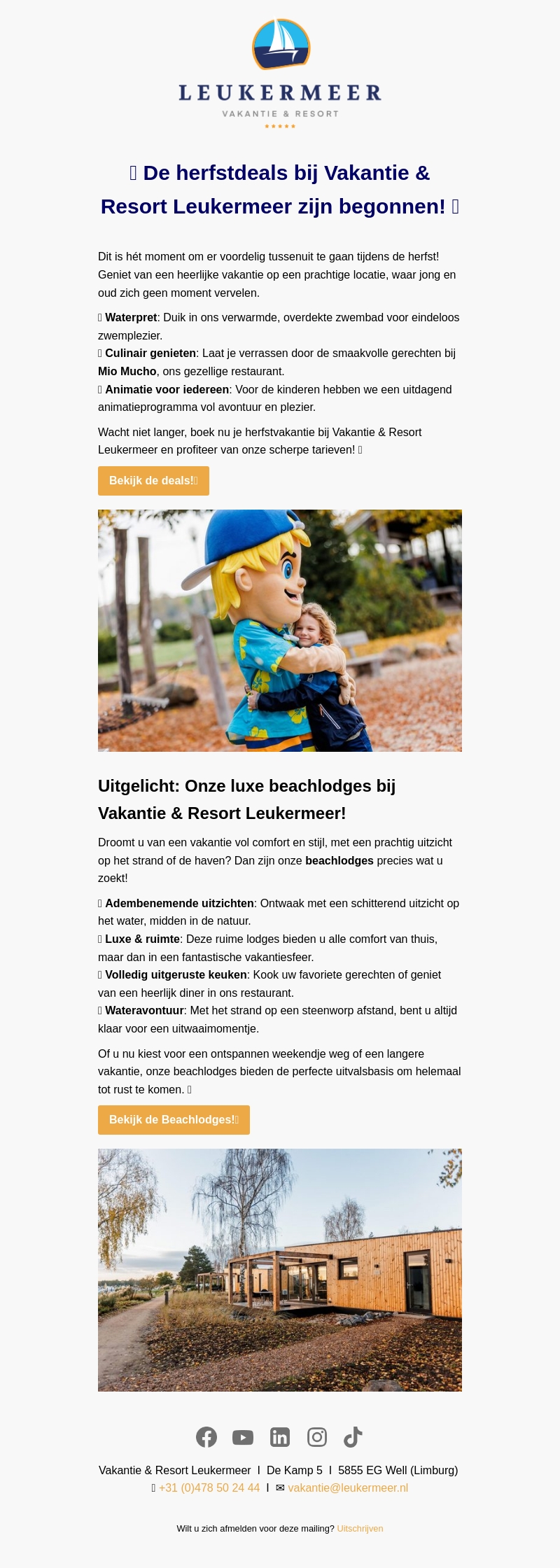 Dit is hΓ©t moment om er voordelig tussenuit te gaan tijdens de herfst bij Vakantie & Resort Leukermeer. Geniet van een verwarmd zwembad, culinaire hoogstandjes en een avontuurlijk animatieprogramma. Boek nu uw herfstvakantie en ontdek onze luxe beachlodges met adembenemende uitzichten, comfort en ruimte.