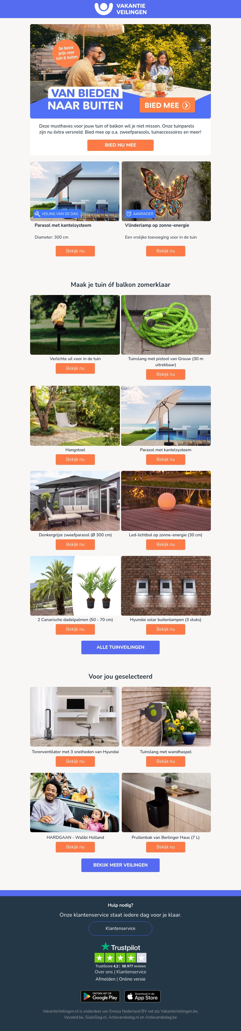 Deze nieuwsbrief biedt geweldige deals voor jouw tuin of balkon. Van zweefparasols en tuinaccessoires tot energiebesparende led-verlichting en comfortabele hangstoelen, je vindt hier alles wat je nodig hebt om je buitenruimte zomer klaar te maken.
