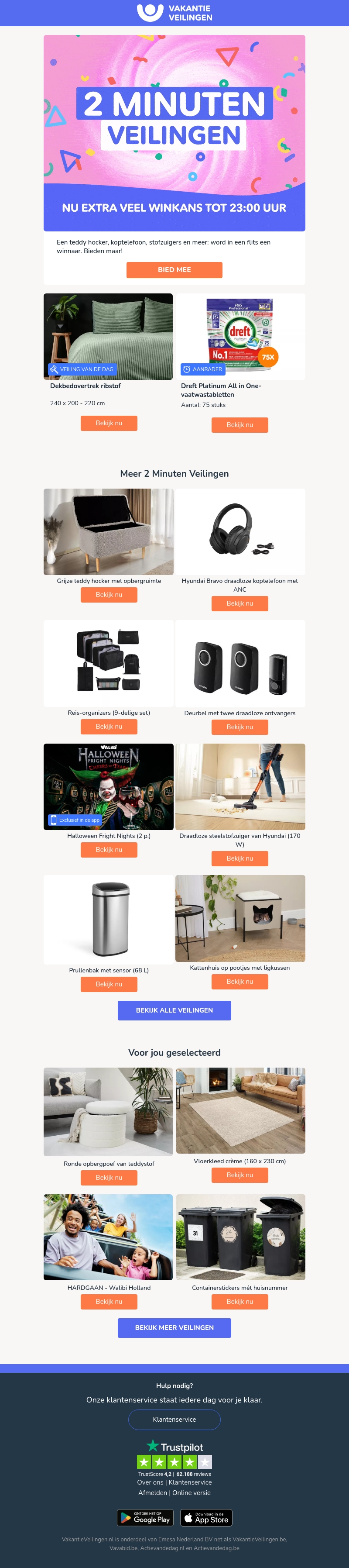 Neem deel aan onze 2 Minuten Veilingen tot 23:00 uur voor een kans om geweldige deals te bemachtigen. Van huishoudelijke apparaten tot reisaccessoires, er is voor ieder wat wils. Mis deze kans niet om je favoriete artikelen tegen een aantrekkelijke prijs te winnen. Bereid je voor, bied snel en win groot. Perfect voor koopjesjagers en fans van spannende veilingen.
