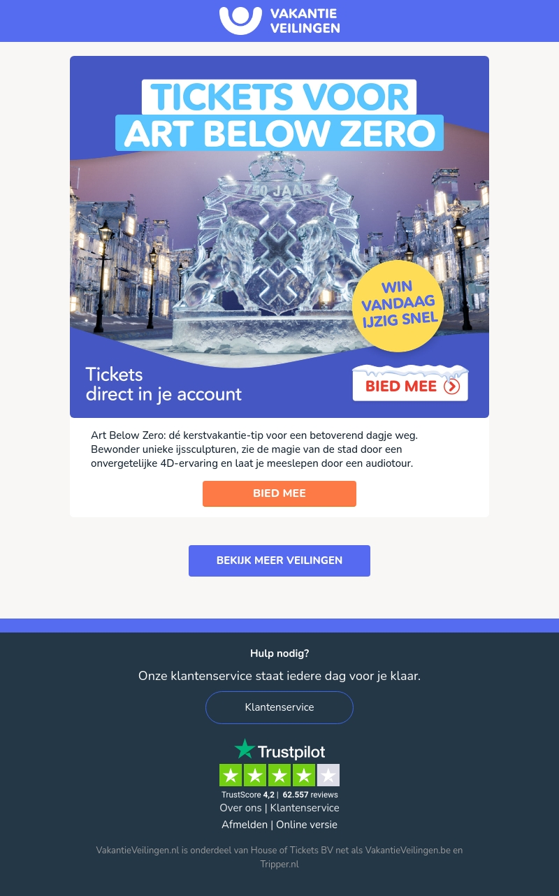 Beleef de magie van Art Below Zero en ontdek een wereld vol ijssculpturen. Deze unieke ervaring is perfect voor een ijzige dag uit. Win vandaag nog tickets en laat je meeslepen door de prachtige creaties tijdens deze adembenemende tentoonstelling. Mis de kans niet om iets speciaals te beleven en bied mee via VakantieVeilingen. Grijp deze kans om een onvergetelijke 4D-ervaring te winnen.