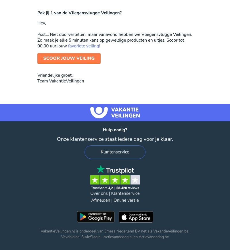Mis deze kans niet! Vanavond bieden wij bij VakantieVeilingen vliegensvlugge veilingen aan. Elke vijf minuten maak je kans op fantastische producten en uitjes. Scoor jouw favoriete veiling voor middernacht.