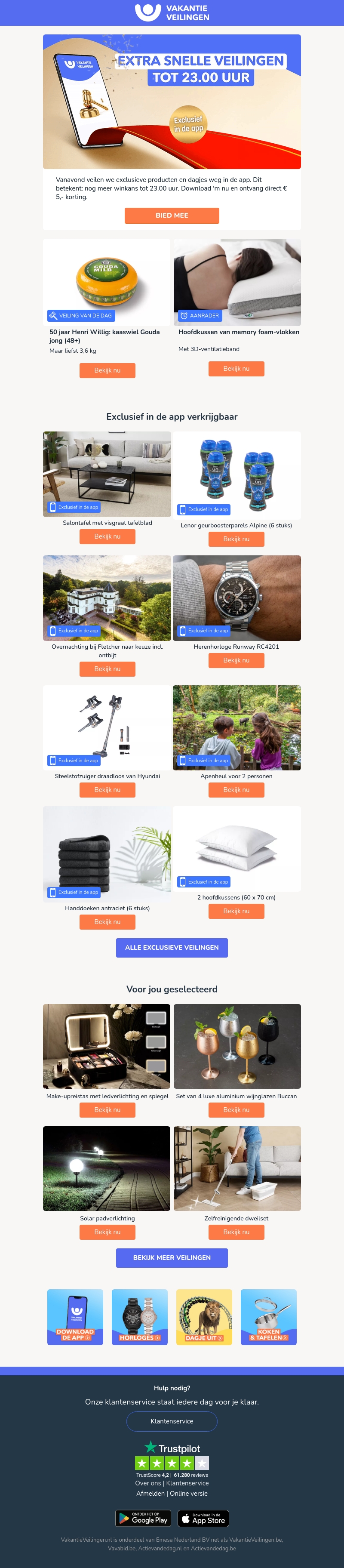Vanavond biedt onze app exclusieve producten en dagdeals aan tot 23.00 uur. Profiteer van de unieke kans om items zoals visgraat salontafels, geurparels van Lenor, en stijlvolle horloges te bemachtigen. Download nu en ontvang direct €5,- korting!