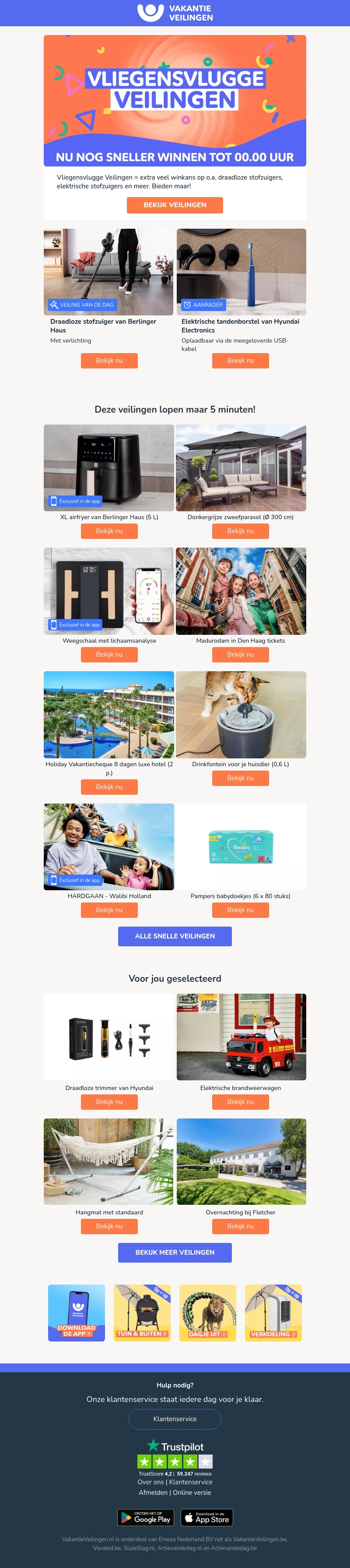 Doe mee met onze Vliegensvlugge Veilingen en maak kans op fantastische prijzen zoals draadloze stofzuigers van Berlinger Haus en elektrische tandenborstels van Hyundai Electronics. Bied direct mee en geniet van de opwinding. Slechts 5 minuten per veiling!