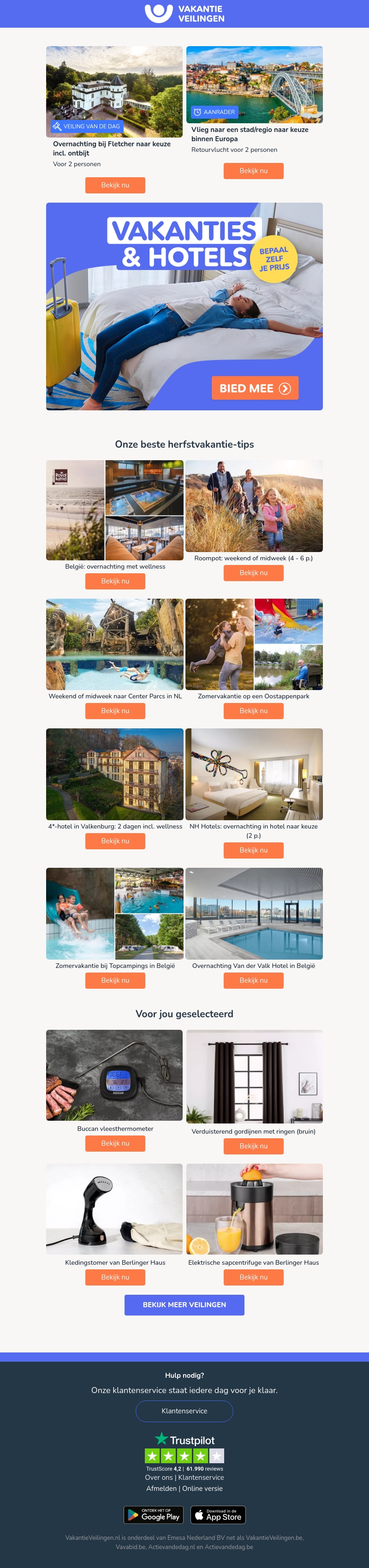 Profiteer van fantastische aanbiedingen bij Fletcher, NH Hotels, Roompot en Center Parcs. Ontdek unieke vakanties en hotels in heel Europa. Boek een ontspannen overnachting of een avontuurlijke vlucht. Bekijk onze herfstvakantie-tips met wellness-opties en gezinsweekenden.