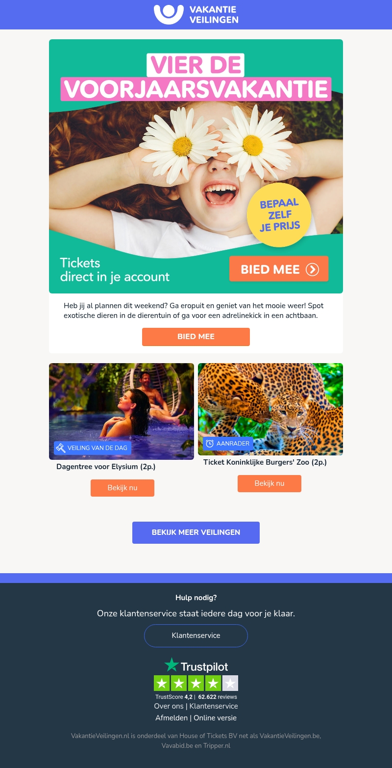 Plan je weekend met VakantieVeilingen en geniet van geweldige ervaringen. Of je nu dieren wilt spotten in de dierentuin, ontspannen in Elysium, of een andere leuke activiteit zoekt, er is voor ieder wat wils. Bepaal je eigen prijs en beleef een onvergetelijk weekend vol avontuur.