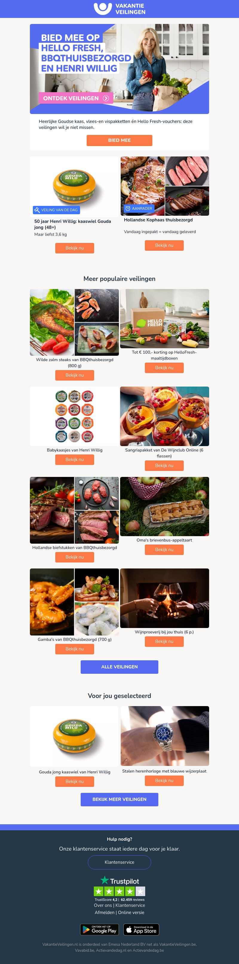 Mis de kans niet om te bieden op smakelijke aanbiedingen van Henri Willig en BBQthuisbezorgd. Geniet van Gouda kaas en sappige BBQ-pakketten. Perfect voor een gezellig avondje thuis met familie of vrienden. Ontvang tot €100 korting op HelloFresh-maaltijdboxen. Bekijk ook exclusieve wijnproeverijen. Nu beschikbaar bij VakantieVeilingen.