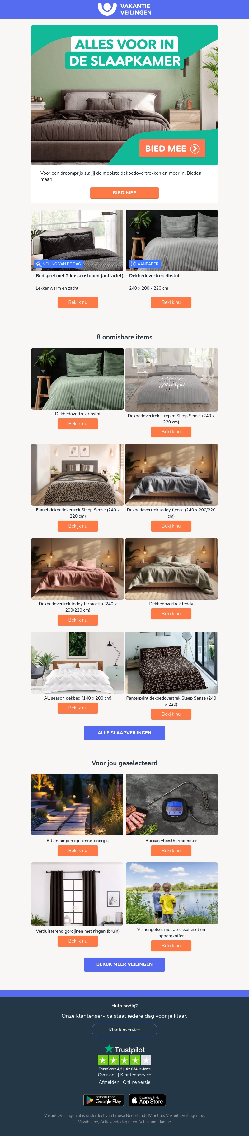 Profiteer van onweerstaanbare aanbiedingen op luxe dekbedovertrekken en beddengoed. In deze nieuwsbrief vind je een breed assortiment aan zachte en comfortabele opties, ideaal voor elk seizoen. Mis je kans niet op fantastische deals bij Vakantie Veilingen. Verhoog het comfort van je slaapkamer voor een droomprijs. Bied nu mee en verbeter je slaapervaring. Bekijk ook geselecteerde items zoals verduisterende gordijnen en meer.