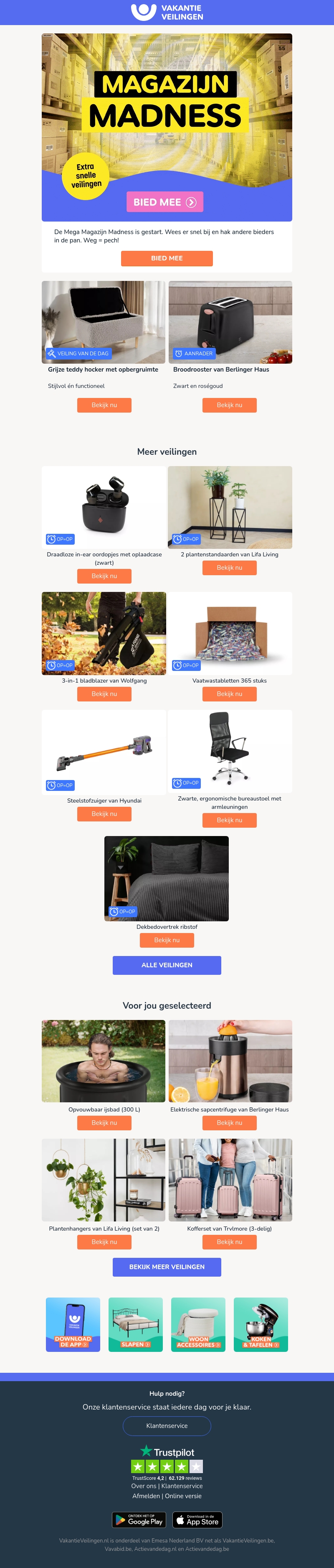De Mega Magazijn Madness is begonnen bij VakantieVeilingen! Grijp je kans op unieke items met extra snelle veilingen. Van draadloze oordopjes tot luxe plantenhangers, er is voor ieder wat wils. Doe mee aan de veilingen en bied lager dan de concurrentie. Mis deze tijdelijke deals niet en haal je favoriete producten in huis.