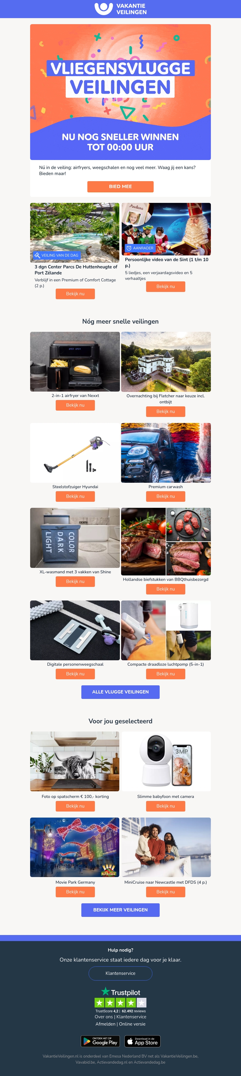 Grijp je kans in de snelle veilingen van VakantieVeilingen, met een breed scala aan producten zoals airfryers, weegschalen en meer. Bied vandaag nog om geweldige deals te scoren en profiteer van onze exclusieve aanbiedingen. Verbreed je keuze met unieke ervaringen en producten met korting.