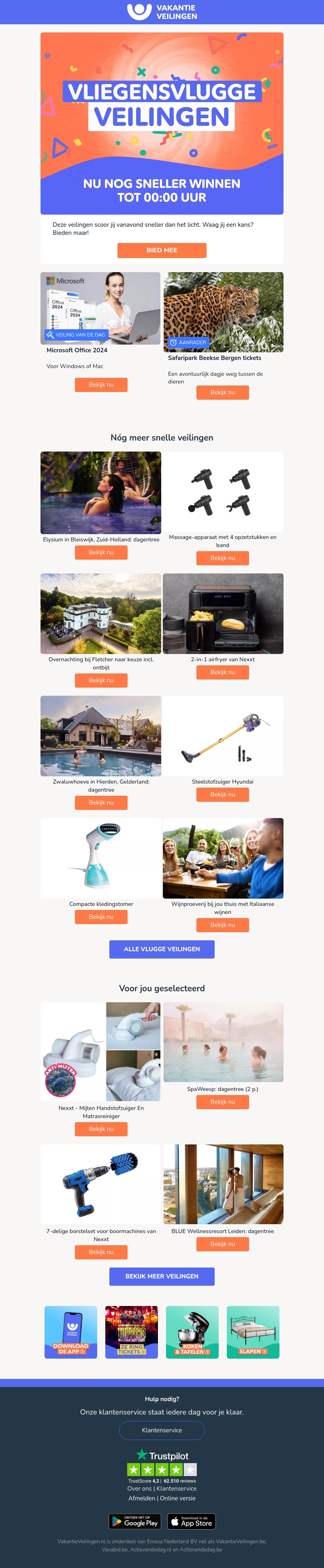 Verlies geen tijd en scoor de beste veilingen sneller dan ooit tevoren bij Vakantie Veilingen. Van softwarepakketten tot exotische uitjes, wij bieden je de kans om spectaculaire deals te winnen. Bied nu mee en zie welke unieke ervaringen op jou wachten. Laat deze kans niet aan je voorbijgaan!
