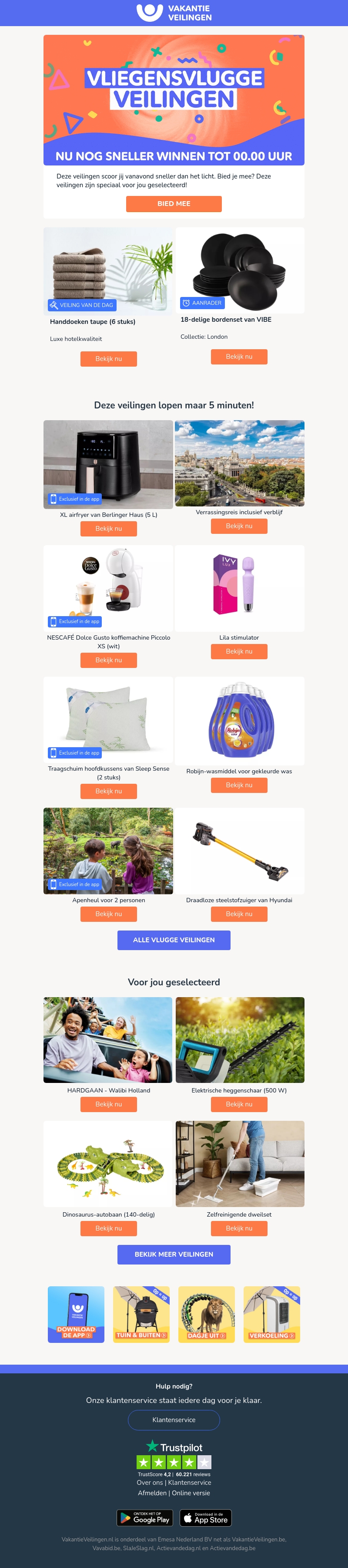 Bekijk de nieuwste veilingen bij Vakantieveilingen en win sneller dan ooit tevoren! Met exclusieve producten zoals handdoeken, borden, airfryers, en nog veel meer. Mis deze kans niet om fantastische aanbiedingen te winnen!