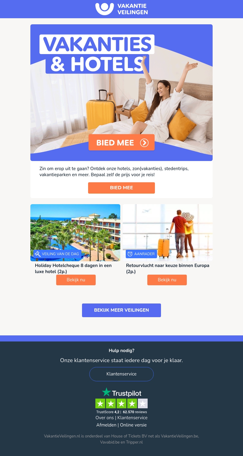 Zin om er even tussenuit te gaan? VakantieVeilingen biedt geweldige deals voor vakanties en hotels, inclusief stedentrips en zonvakanties. Bied mee en bepaal zelf de prijs die je betaalt voor 8 dagen in een luxe hotel of een retourvlucht binnen Europa.