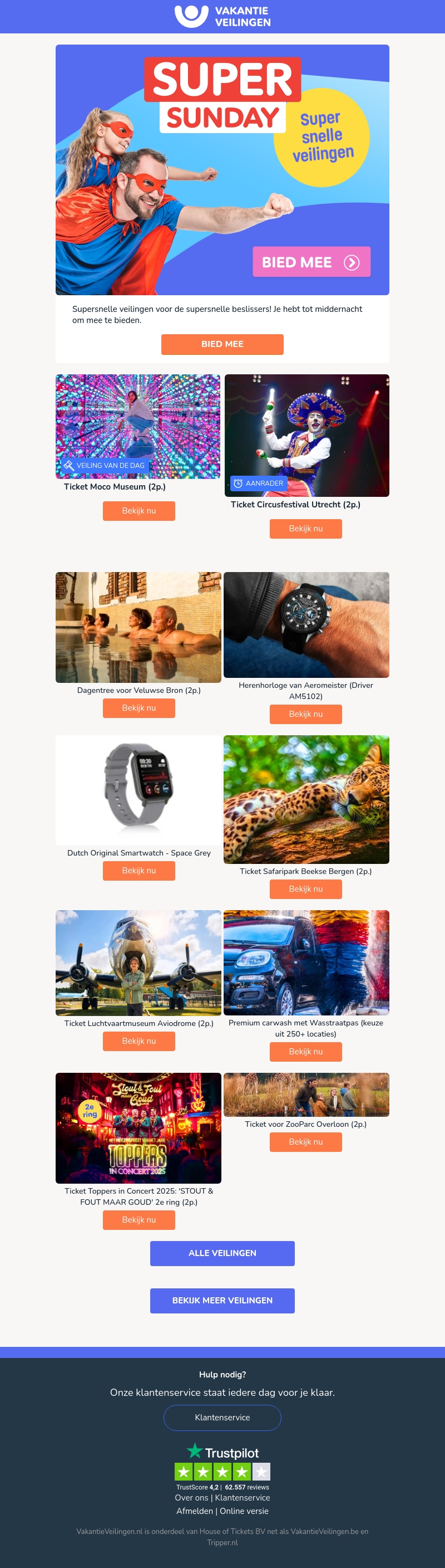 Maak je klaar voor Super Sunday met VakantieVeilingen! Deze nieuwsbrief biedt exclusieve dagjes uit en adrenaline-pompende veilingen. Je kunt bieden op tickets voor topattracties zoals het Moco Museum en Circustheater Utrecht. Geniet ook van ontspannende ervaringen zoals de Veluwse Bron. Grijp nu je kans en zorg voor een onvergetelijke zondag.