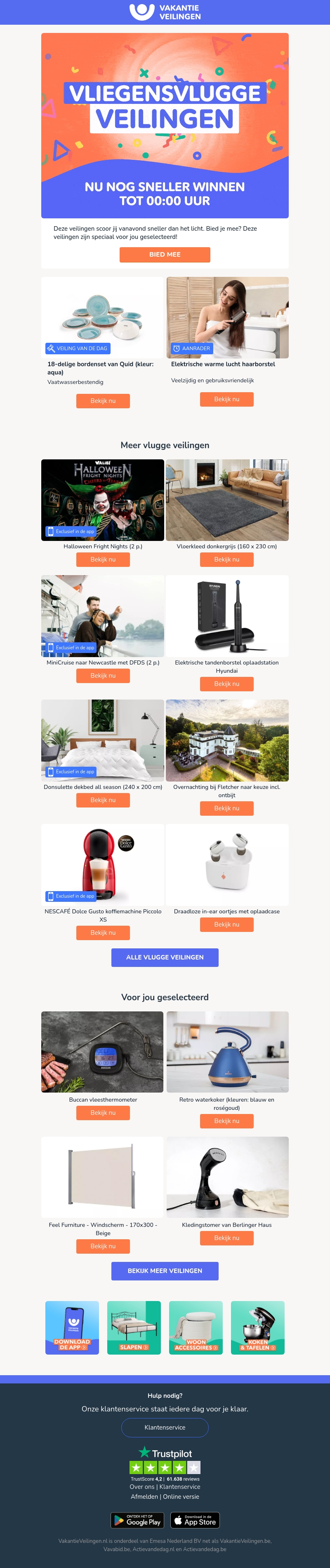 Doe vanavond nog mee aan de Vliegensvlugge Veilingen en maak kans op fantastische producten. Van vloerbedekking tot elektrische tandenborstels en van cruises tot stijlvolle meubels - alles komt voorbij. Grijp je kans nu en bied snel!