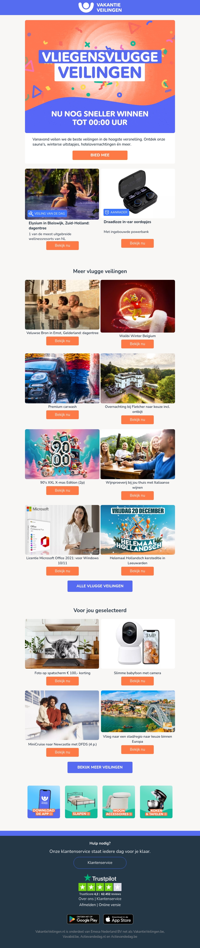 Ervaar de spanning van vliegensvlugge veilingen bij VakantieVeilingen.nl. Ontdek een breed scala aan aanbiedingen, van ontspannende saunaverblijven tot spannende daguitstapjes en meer. Profiteer van exclusieve kortingen en geniet van een unieke ervaring. Mis deze kans niet en bied direct mee. Ontdek de beste deals voor jouw volgende avontuur.