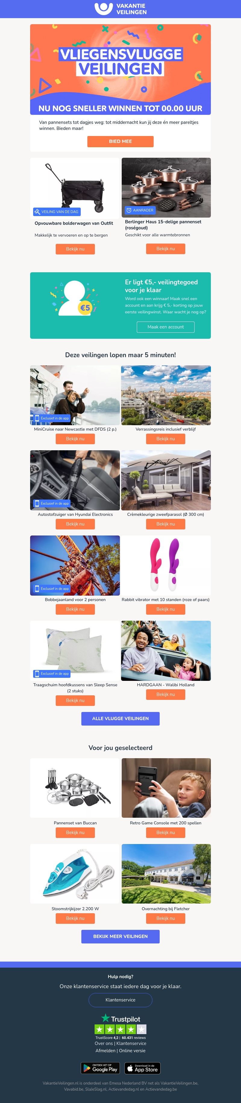 Bekijk onze nieuwste vliegensvlugge veilingen! Van pannensets en stofzuigers tot fantastische dagjes weg, hier is voor ieder wat wils. Zorg dat u niet achterblijft en doe snel een bod. Ook krijgt u €5 veilingsaldo als u een nieuw account aanmaakt. Wacht niet langer, de beste deals wachten op u!