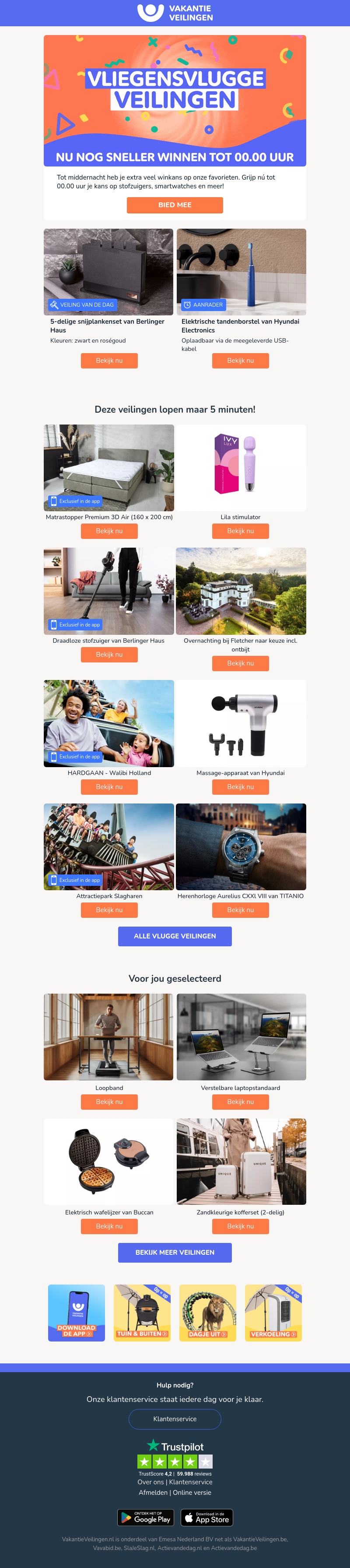 Doe mee aan onze vliegensvlugge veilingen en win geweldige producten zoals stofzuigers, smartwatches en meer. Deze aanbiedingen lopen maar kort, dus wees er snel bij! Nieuw deze week: een Berlinger Haus snijplankenset en een Hyundai tandenborstel. Pak jouw kans en scoor vandaag nog!