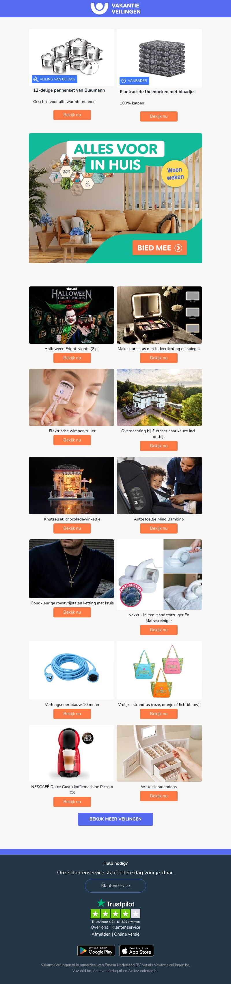 VakantieVeilingen presenteert vlijmscherpe veilingen voor jouw keuken en huis. Ontdek topdeals zoals pannensets, theedoeken en meer. Grijp jouw kans op unieke producten tegen lage prijzen. Perfect voor iedereen die zijn keuken wil vernieuwen. Doe nu mee met de spannende veilingen! Mis je kans op geweldige kortingen niet.