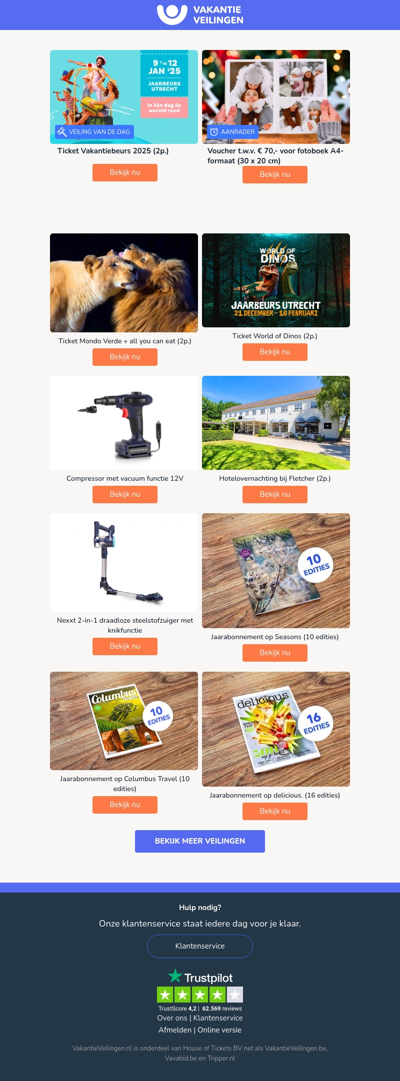 Bezoek de Vakantiebeurs 2025 en ontdek unieke ervaringen en geweldige aanbiedingen. Van een dag in de Jaarbeurs Utrecht tot aan mooie vakantiefoto's, er is voor ieder wat wils. Mis ook de speciale veilingen en vouchers niet voor een onvergetelijke tijd. Wees erbij van 9 tot 12 januari 2025 en geniet van de beste reisdeals. Laat je inspireren en plan je volgende avontuur!