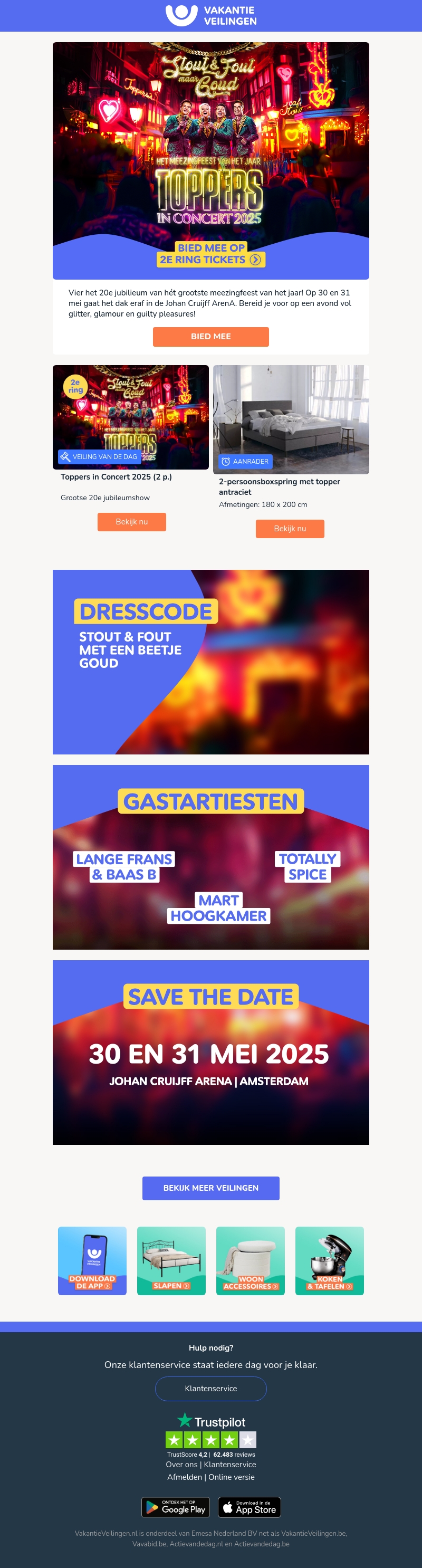Vier het 20e jubileum van Toppers in Concert met een spectaculaire show op 30 en 31 mei 2025 in de Johan Cruijff ArenA. Bereid je voor op een avond vol glamour en guilty pleasures! Mis de kans niet om 2e ring-tickets te bemachtigen en geniet van gastartiesten als Lange Frans & Baas B en Totally Spice. De dresscode is 'Stout & Fout met een beetje Goud'.