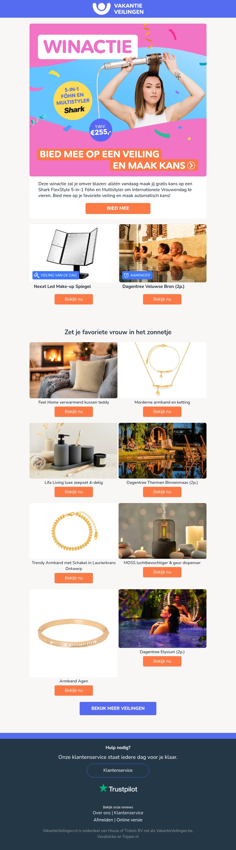 Neem vandaag deel aan onze speciale winactie en maak kans op een gratis Shark FlexStyle 5-in-1 föhn en Multistyler ter waarde van €255. Bied mee op je favoriete veiling voor een automatische deelname. Ontdek daarnaast onze gevarieerde productaanbiedingen, van luxe thermenuitjes tot stijlvolle accessoires. Er is voor ieder wat wils. Mis deze kans niet om geweldige producten en ervaringen te winnen.