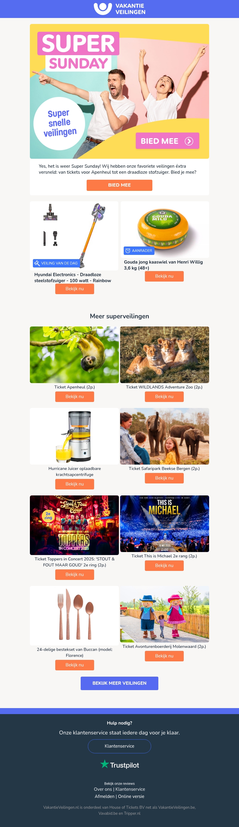 Het is weer Super Sunday bij VakantieVeilingen! Geniet van snelle veilingen met geweldige deals, zoals tickets voor Apenheul en een draadloze stofzuiger. Mis je kans niet om fantastische producten en ervaringen te winnen. Doe nu mee en ontdek de spanning van Super Sunday.