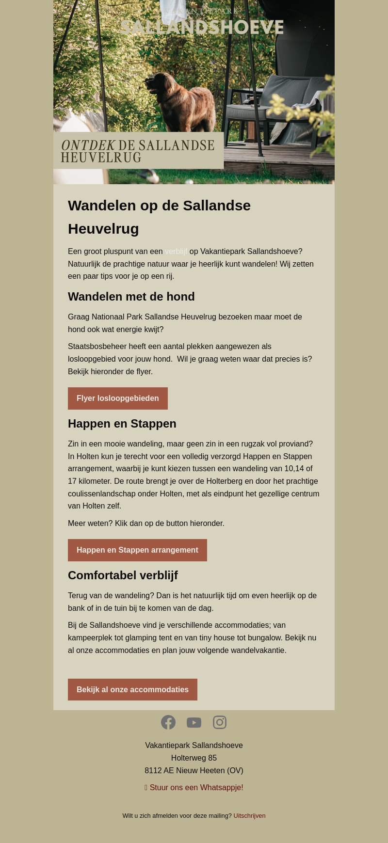 Een groot pluspunt van een verblijf op Vakantiepark Sallandshoeve is de prachtige natuur. Bezoek Nationaal Park Sallandse Heuvelrug, geniet van speciale wandelgebieden voor honden, en laat je verwennen met het Happen en Stappen arrangement. Eindig de dag comfortabel in een van de accommodaties van de Sallandshoeve.