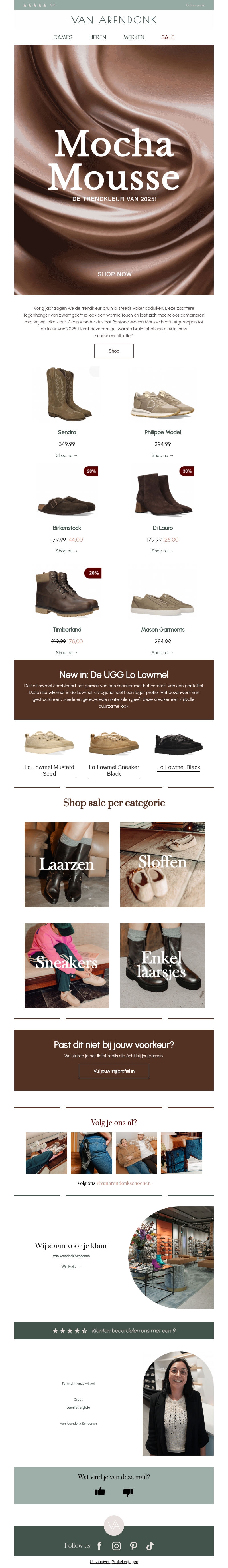 Van Arendonk presenteert Mocha Mousse als dé trendkleur van 2025. Ontdek een stijlvolle collectie schoenen en accessoires in deze warme tint. Geniet van exclusieve aanbiedingen op topmerken zoals Timberland, Di Lauro en meer. Mis de introductie van de nieuwe UGG Lo Lommels niet. Shop per categorie voor laarzen, sneakers, en meer.