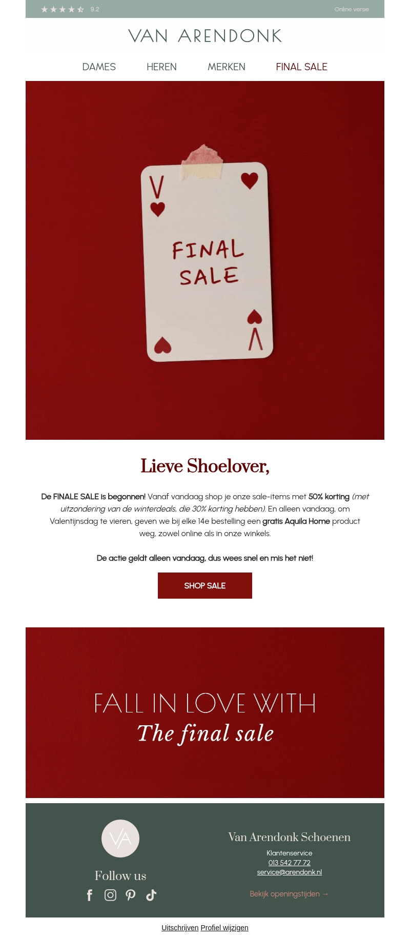 De finale sale is begonnen bij Van Arendonk! Profiteer van 50% korting op geselecteerde items, met uitzondering van winterdeals die 30% korting bieden. Als speciale Valentijnsdagactie ontvang je bij elke 14e bestelling een gratis Aquila Home product. Deze aanbieding is alleen vandaag geldig, dus mis het niet!