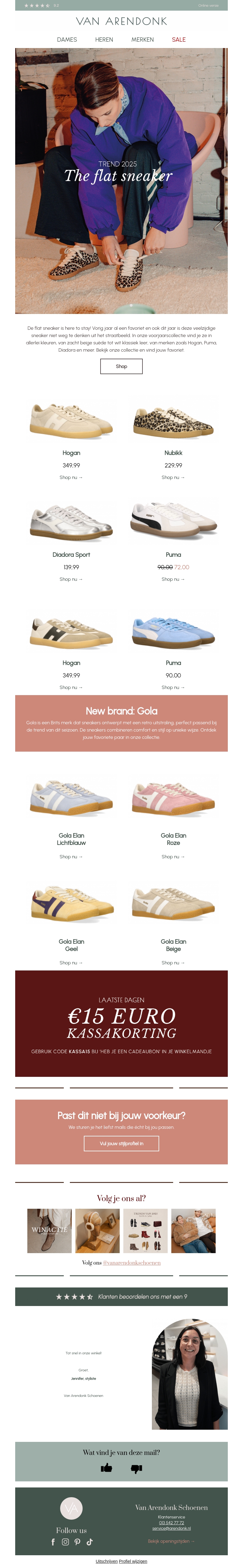 Deze nieuwsbrief van Van Arendonk presenteert de laatste trends in sneakers voor 2023. Ontdek stijlen van merken zoals Hogan, Nubbikk, en Puma. Bovendien kun je gebruikmaken van een speciale kassakorting met de code KASSA15. Mis deze kans niet om je schoenencollectie aan te vullen met de nieuwste ontwerpen.