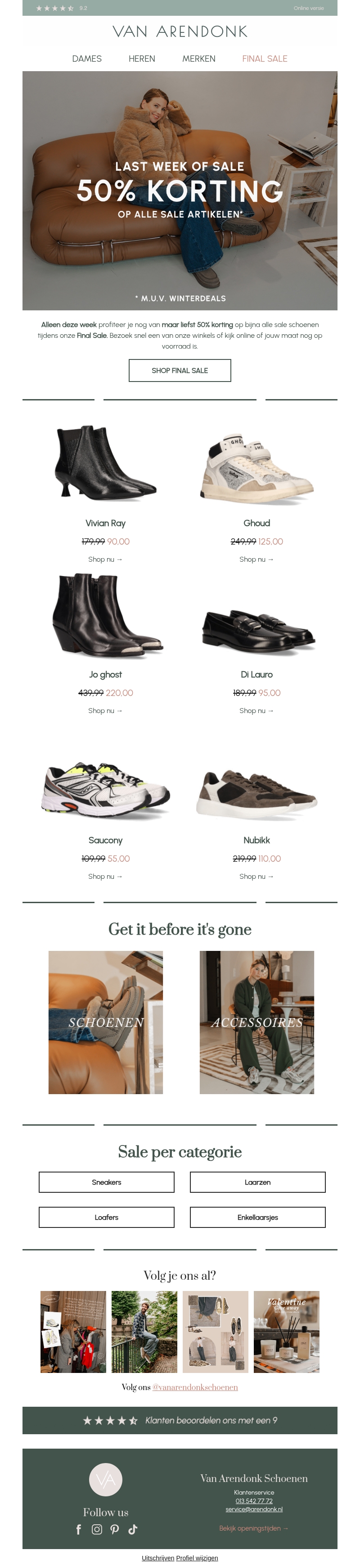 Dit is de laatste week van de grote uitverkoop bij Van Arendonk. U kunt genieten van maar liefst 50% korting op bijna alle sale artikelen. Dit is het perfecte moment om uw favoriete schoenen en accessoires aan te schaffen. Bezoek onze winkels of kijk online naar onze collectie, want op is op. Wacht niet te lang, deze actie geldt alleen deze week.
