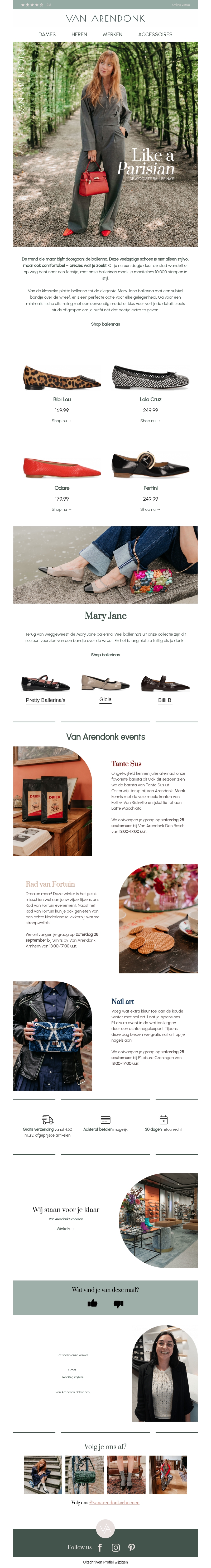 Voel je als een Parijse met de nieuwste mode van Van Arendonk. Ontdek de stijlvolle damesschoenen en accessoires die perfect zijn voor elke gelegenheid. Van elegante Mary Janes tot trendy ballerina's, hier vind je alles wat je nodig hebt. Bezoek ook onze evenementen en ontdek meer over ons aanbod.