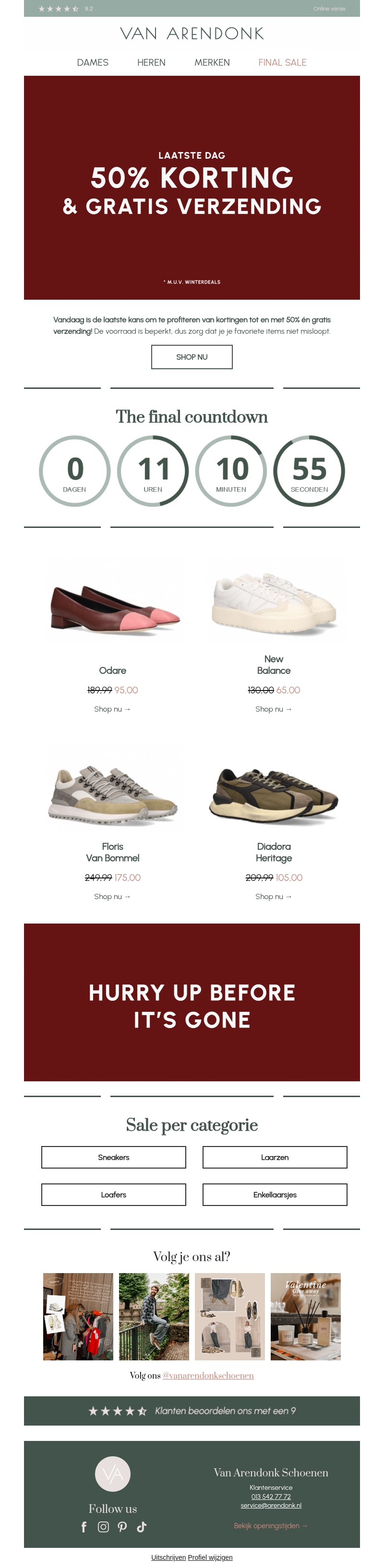 Vandaag is de laatste dag om te profiteren van onze maandelijkse uitverkoop. Geniet van 50% korting op geselecteerde producten en gratis verzending. De voorraad is beperkt, dus wees er snel bij. Kies uit een breed assortiment van schoenen, sneakers en laarzen. Mis deze kans niet om uw favoriete items te bemachtigen. Shop nu en ontdek geweldige deals!