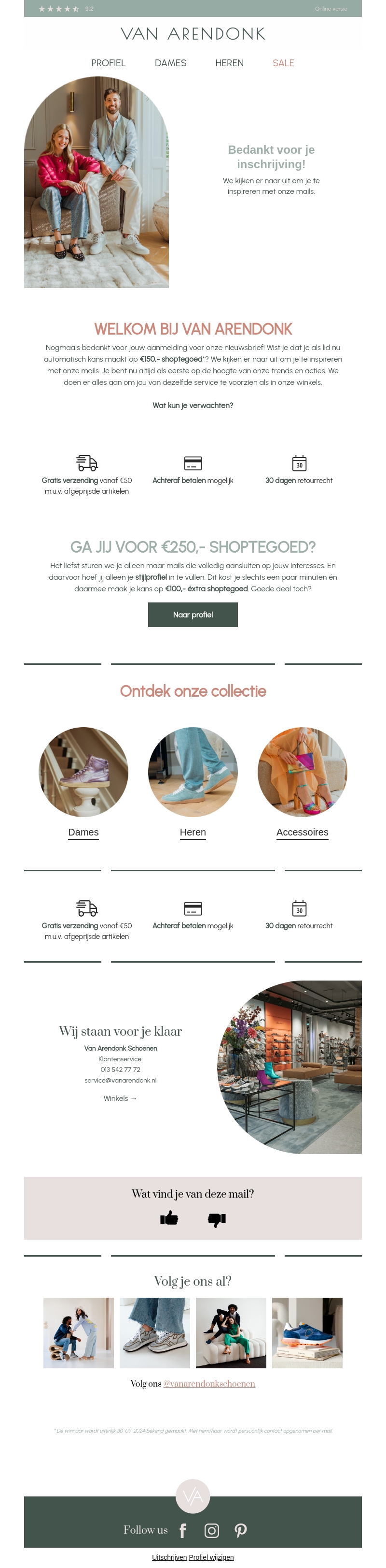 Welkom bij Van Arendonk! Bedankt voor je inschrijving op onze nieuwsbrief. Ontdek onze nieuwste collecties en geniet van gratis verzending vanaf €50. Maak kans op €250,- shoptegoed door je stijlprofiel in te vullen. Word geïnspireerd door onze trends en exclusieve voordelen.