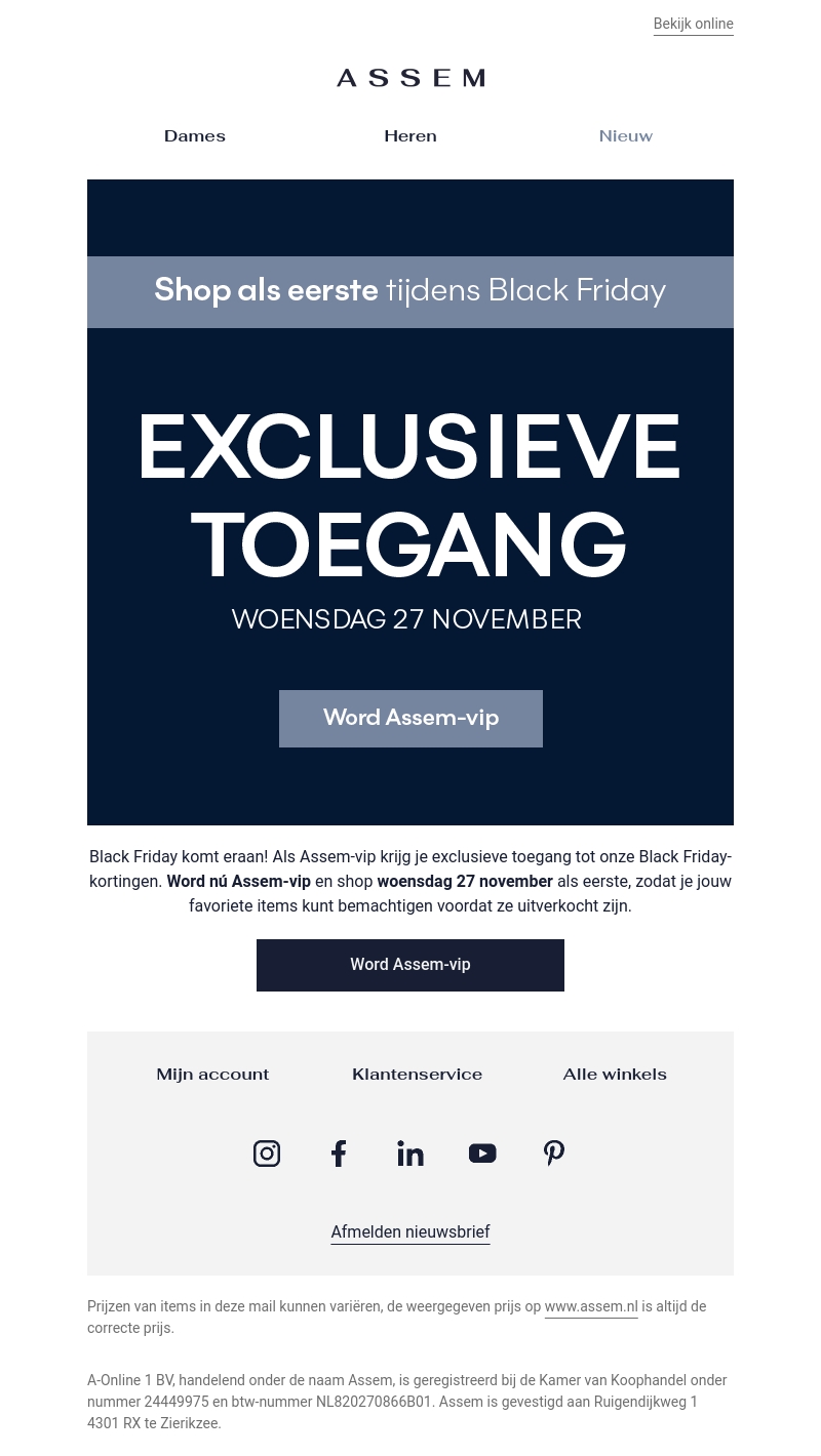 Word een Assem-vip en geniet van exclusieve toegang tot de Black Friday-kortingen. Schrijf je in voor 27 november en shop als eerste jouw favoriete items. Mis deze kans niet om te profiteren van geweldige aanbiedingen voordat ze uitverkocht zijn.